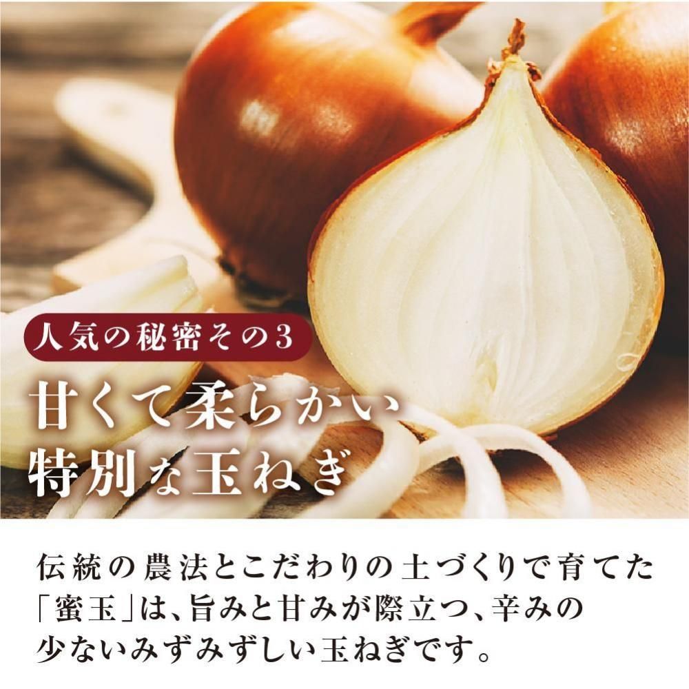 100%有機肥料で育てた特別栽培の淡路島玉ねぎ。甘みと風味が詰まった玉ねぎは、 肉厚でやわらかな食感。淡路島玉ねぎの特徴が「みつ」。淡路島玉ねぎを通じて、 多くの出会いがありました。人が集まる「みつ」。安心安全はもちろん、 日本一おいしい淡路島玉ねぎを目指す、その想いが「みつ」。 多くの「みつ」が詰まった淡路玉ねぎを蜜玉(みつたま)と命名しました。